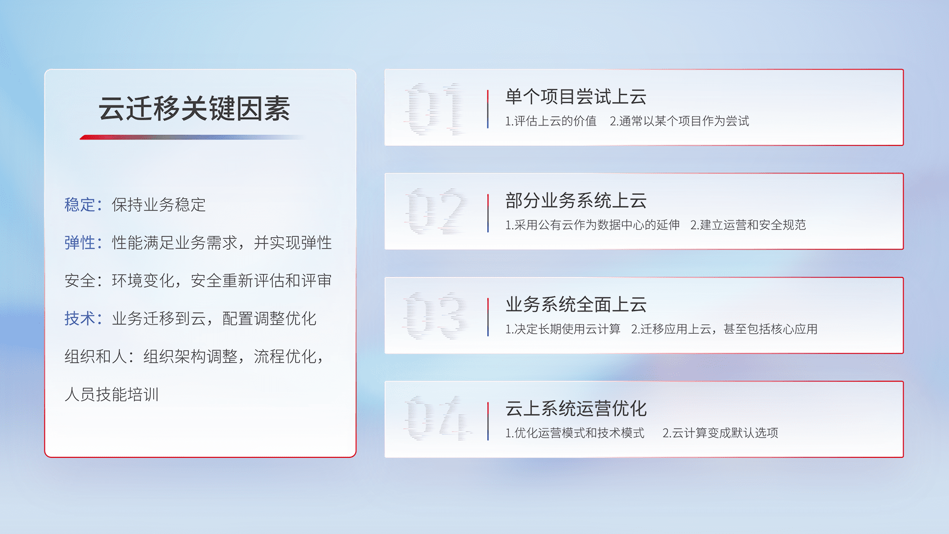 结合实际业务,,,,从规划设计、、、云平台选型、、、云原生改造、、数据迁移、、、、集成交付,,,,迁移全过程为客户识别最佳上云路径,,做好风险识别管理,,,设计网络架构、、、、身份权限、、、、安全审计合规、、、操作审计、、、、日志审计、、、监控告警策略、、、多站点容灾设计等,,,,对云上基础设施进行整体规划,,提升IT治理水平,,,以满足弹性、、、高可用、、、、高性能的需求。。。。